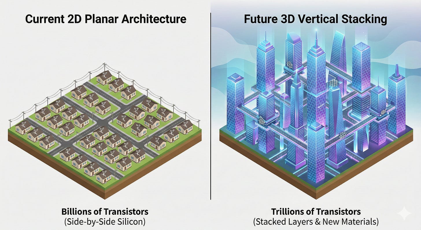 A silicon atom is only 0.2 nanometers thick. In the <1nm chip archtecture, we’re talking transistors that are just a few silicon atoms wide. There’s only so much deeper you can go without literally breaking an atom in half (and we don’t want that for obvious reasons). So where do we go from sub 1nm?